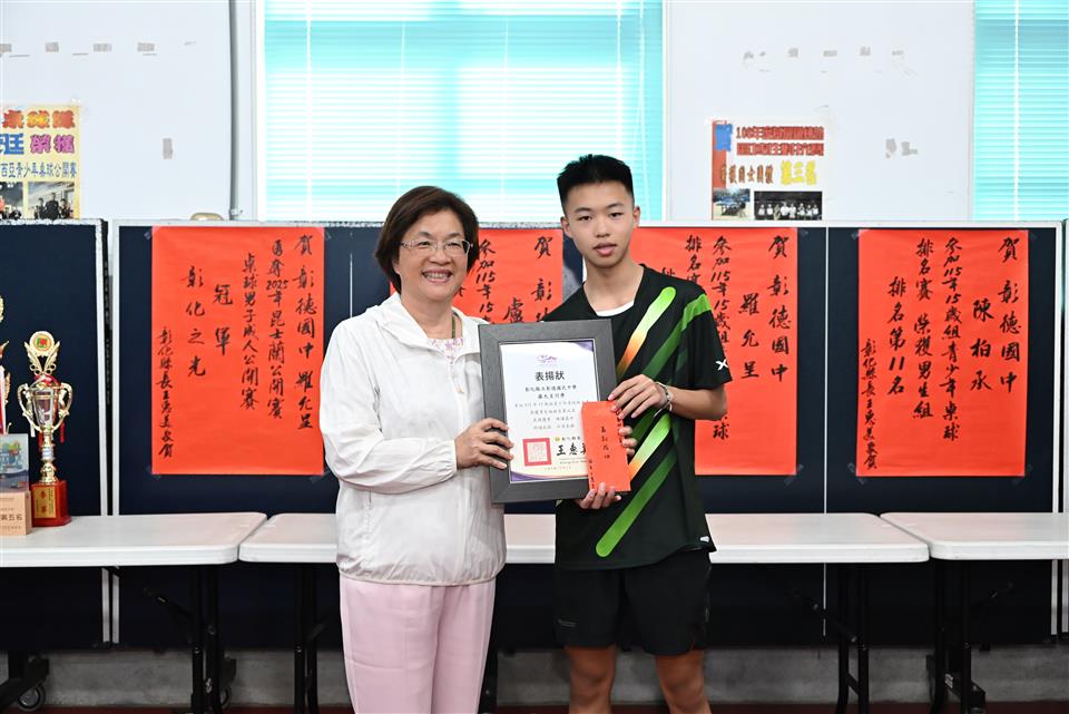 新聞焦點 王惠美縣長前往彰德國中慰勉桌球選手 表達支持與鼓勵 發布日期 2026/02/23~2026/03/23 | 發佈單位: 教育處 | 發佈日期: 喬科長 7112175 | 更新日期 2026/02/23 | 瀏覽人數: 4人 彰化體育屢創佳績,彰化縣長王惠美於今(23)日下午前往彰德國中,慰勉在「115年15歲組青少年桌球排名賽」中表現亮眼的桌球選手與教練團隊。王縣長表示,在這次全國高手雲集的激烈角逐中,彰德國中有3名選手從全國260位選手中脫穎而出,成功挺進男子組全國前12名,入選比例為全國第2、非六都第1,亮眼成績再次讓全國看見彰化縣深耕體育的豐碩能量。 王縣長表示,其中盧識淵同學勇奪全國第3名,並取得2026年亞洲及世界青少年錦標賽代表台灣的國手資格;羅允呈同學獲得第9名,陳柏承同學則列第11名。感謝教練悉心教導,以及孩子不斷的自我要求、刻苦訓練,最終展現優異成果。 王縣長指出,這份榮耀不僅是選手的個人成就,更是彰化體育「基層三級培訓」扎根銜接的展現。感謝大竹國小黃馭寰校長與陳宗翰教練的付出,陳教練長期跨校同時訓練大竹國小與彰德國中的選手,一貫的精準指導,是孩子能無礙銜接、屢創佳績的重要關鍵。同時感謝彰德國中石興銓校長帶領的教學團隊、顧問團、家長會與體育班後援會的鼎力支持,以及家長的強大後援,才能創造今天的亮眼成就。 王縣長除頒發獎勵金外,也特別贈送「營養品」慰勞團隊,勉勵大家勤練之餘也要妥善照顧身體,並期許繼續精進,為彰化及台灣爭光。隨後王縣長更親自下場,與在場選手以球會友、交流互動,現場氣氛輕鬆熱絡。 教育處表示,透過整合資源與完善制度,彰化孩子在縣內同樣能發揮潛能,實踐「彰化人留彰化,彰化人創奇蹟」的目標。未來將持續投入經費與資源,精進訓練環境,引領更多在地優秀的運動人才在各項國家及國際賽事中大放異彩。 陪同縣長慰勉的貴賓有縣議員暨桌球委員會主委張錦昆、教育處長蔡金田、彰德國中校長石興銓、家長會長吳家煌、體育班後援會長張志源、顧問團副團長宋玅女、大竹國小校長黃馭寰、桌球委員會總幹事蘇巨超、教練、選手家長及地方仕紳等。