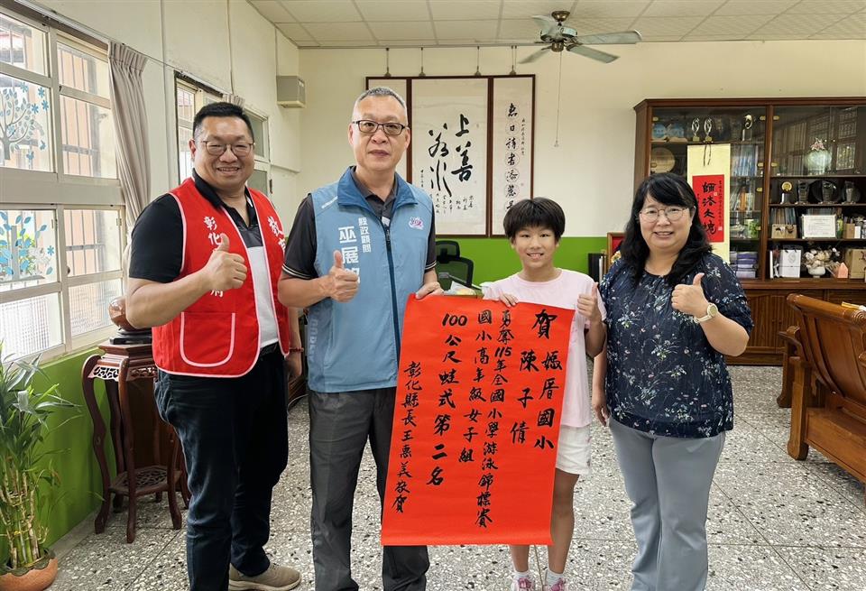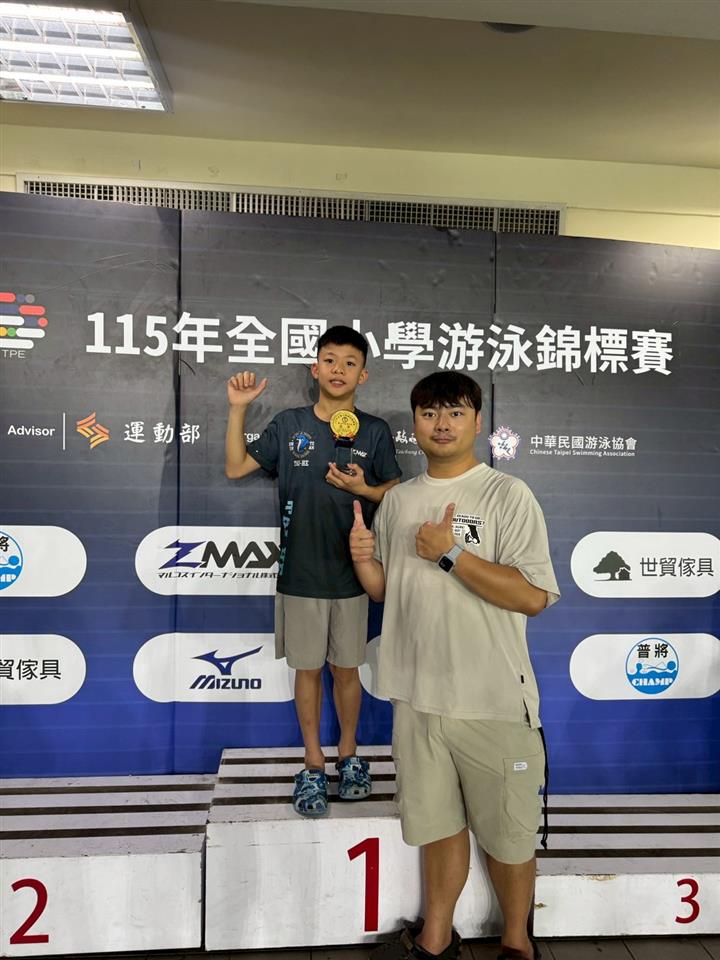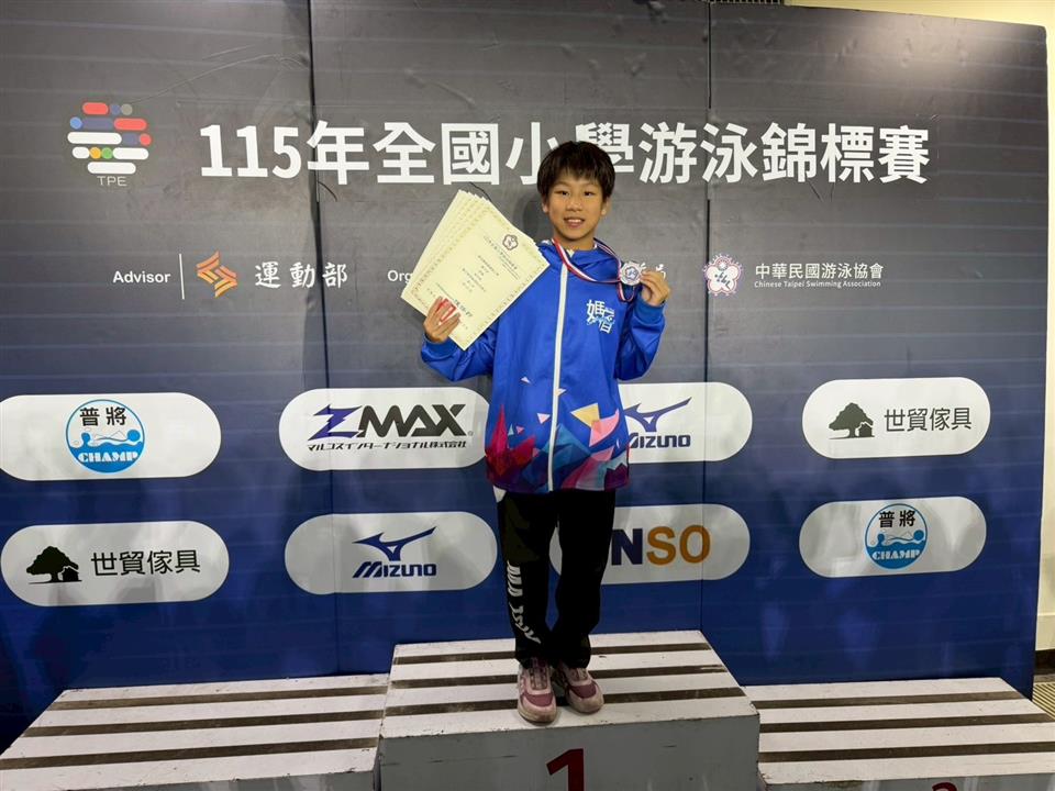 新聞焦點 彰化泳將再傳捷報!泰和國小勇奪全國團體總錦標亞軍 4金1銅、媽厝國小1銀再創佳績 發布日期 2026/04/17~2026/05/13 | 發佈單位: 教育處 | 發佈日期: 體育保健科 喬科長 7112175-20 | 更新日期 2026/04/13 | 瀏覽人數: 6人 彰化縣基層體育再創佳績!泰和國小於4月2日至4月5日在台中市北區運動中心參加中華民國游泳協會(CTSA)主辦的「115年全國小學游泳錦標賽」中表現亮眼,勇奪4金1銅,榮獲全國國小中年級男生組團體總錦標亞軍,更締造1項破大會紀錄,媽厝國小則奪下1銀,展現彰化深耕基層游泳運動的培育成果。彰化縣長王惠美讚賞選手在全國賽場突破自我、勇創佳績,展現平時訓練成果。縣府將持續投入資源,完善基層培訓與競賽環境,讓孩子在運動中培養自信與競爭力。 本次賽事吸引全國近千名選手參賽,競爭激烈。泰和國小泳隊於國小中年級組脫穎而出,其中張而呈同學表現最為亮眼,勇奪50公尺蛙式、100公尺蛙式(破大會紀錄)、50公尺自由式及100公尺自由式4面金牌,並於200公尺混合式再添1銅,展現速度與耐力兼具的全能實力;劉宸語同學亦穩定發揮,於100公尺仰式名列第7。媽厝國小陳子倩同學則於高年級女子組100公尺蛙式勇奪銀牌、200公尺混合式第4名、100公尺蝶式第4名、50公尺蛙式第5名、400公尺自由式第7名、50公尺蝶式第7名,展現多元培育成果。 教育處指出,本縣國小於全國賽締造佳績,顯示培訓體系逐步開花結果。未來將持續整合中央與地方資源,強化運動培育機制,讓彰化選手持續在全國賽場「游」出競爭力、再創高峰。 一、總成績 (一)金牌4面、銀牌1面、銅牌1面 (二)國小中年級男子組團體總錦標:亞軍(泰和國小) 二、各校成績 (一)泰和國小 1. 金牌4面(張而呈:50公尺蛙式、100公尺蛙式〔破大會紀錄〕、50公尺自由式、100公尺自由式) 2. 銅牌1面(張而呈:200公尺混合式) (二)媽厝國小:高年級組 1. 銀牌1面(陳子倩:100公尺蛙式)